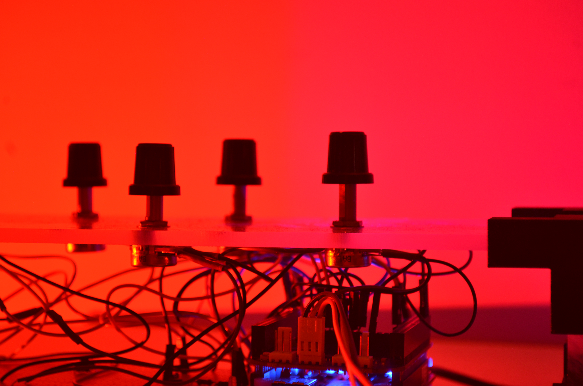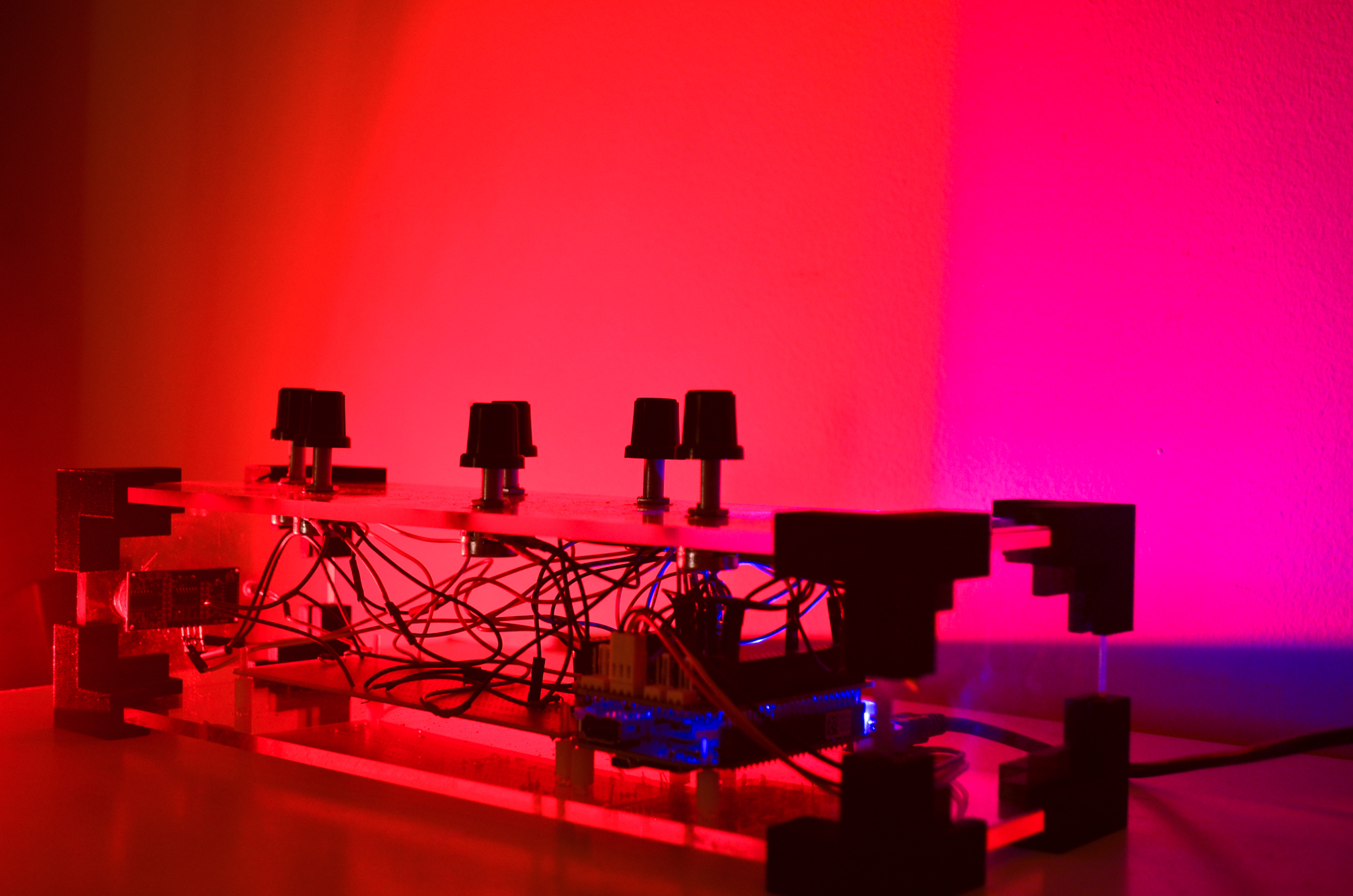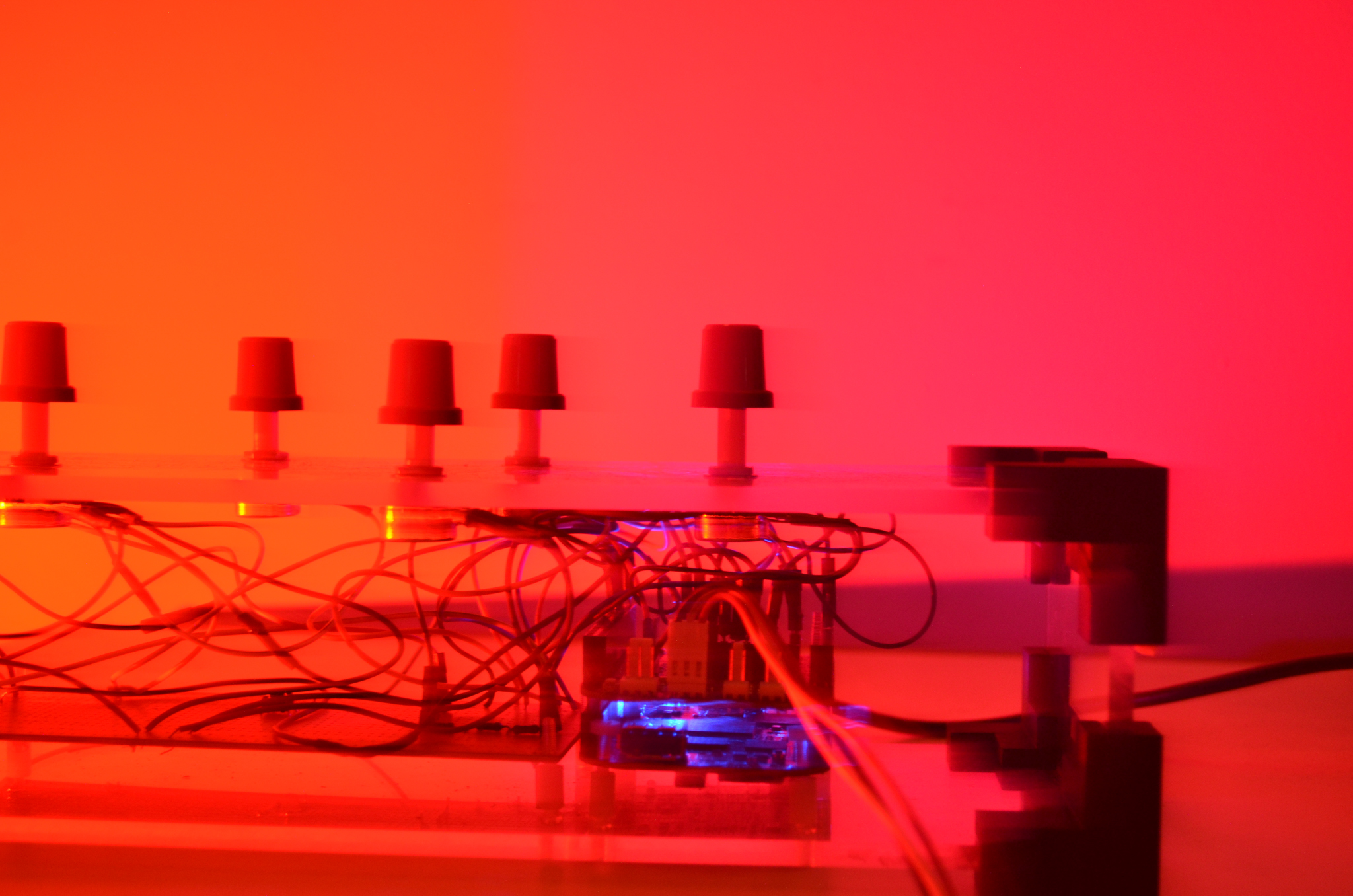 The acrylic structure of the synth contains hardware (Bela) and works in tandem with software (Pure Data).