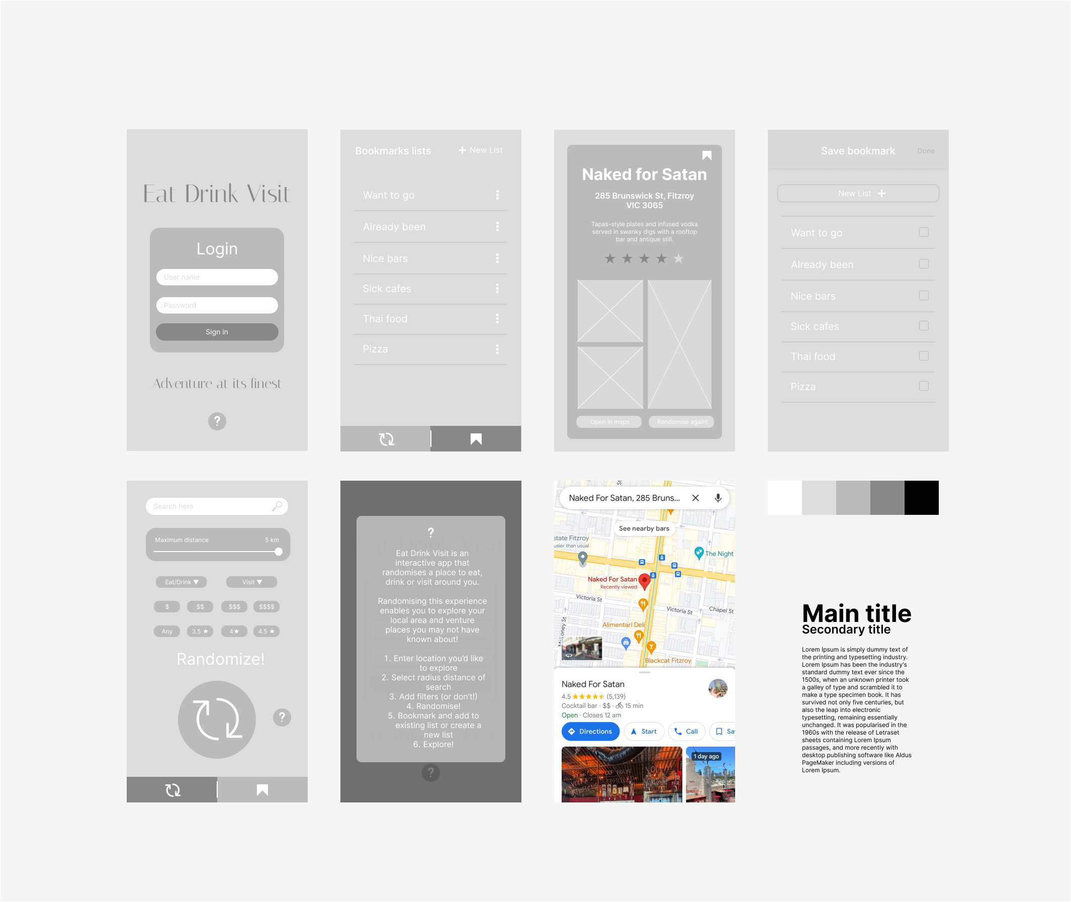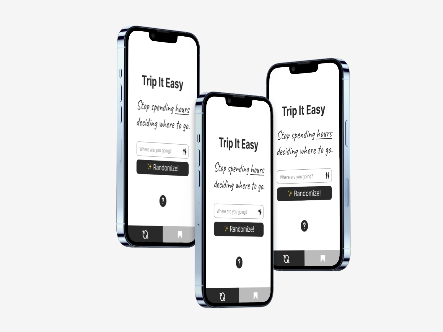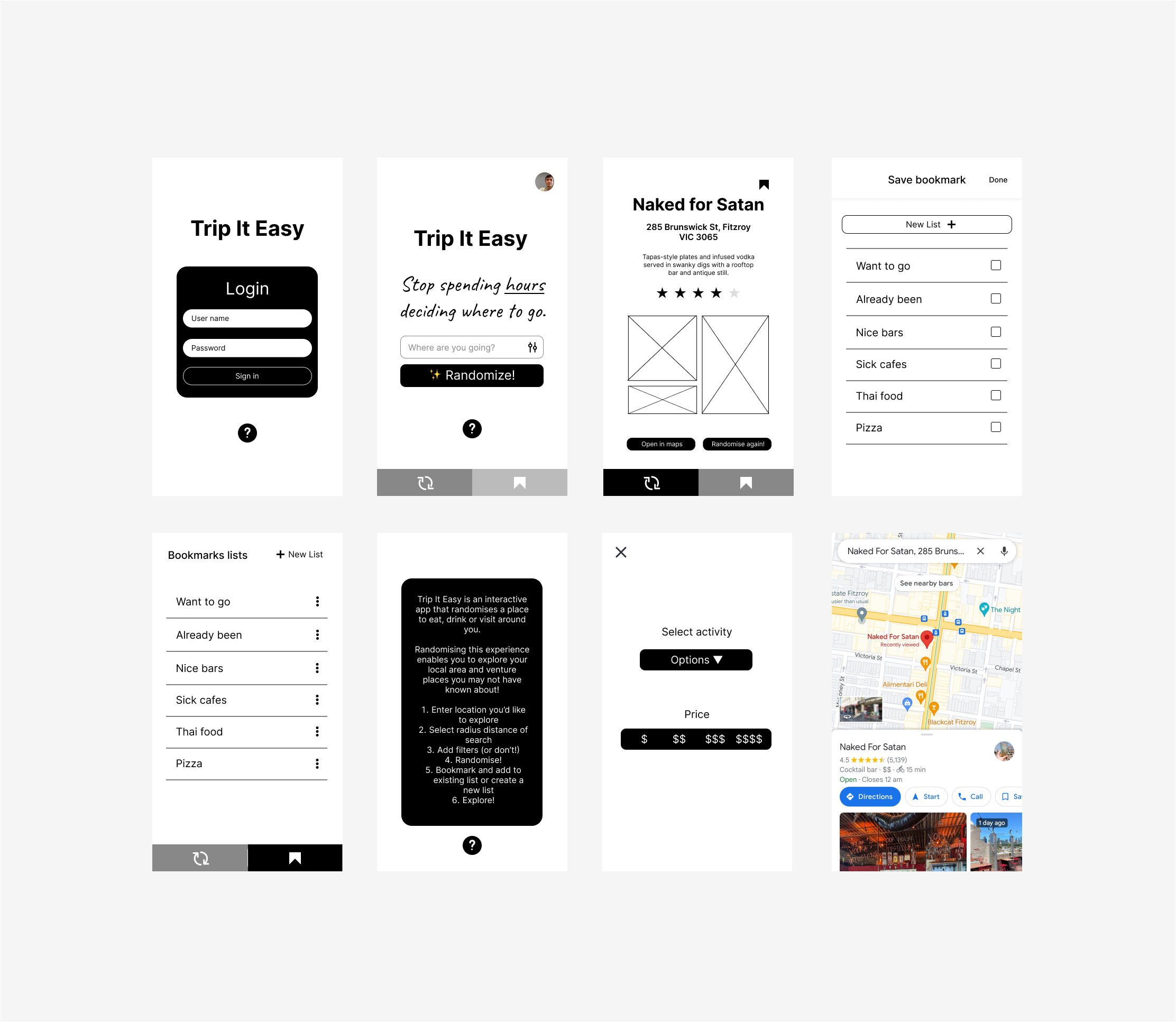 Trip It Easy is an app that playfully utilises data from Google maps to randomise cafes, bars, restaurants and other activites around the location of the user.